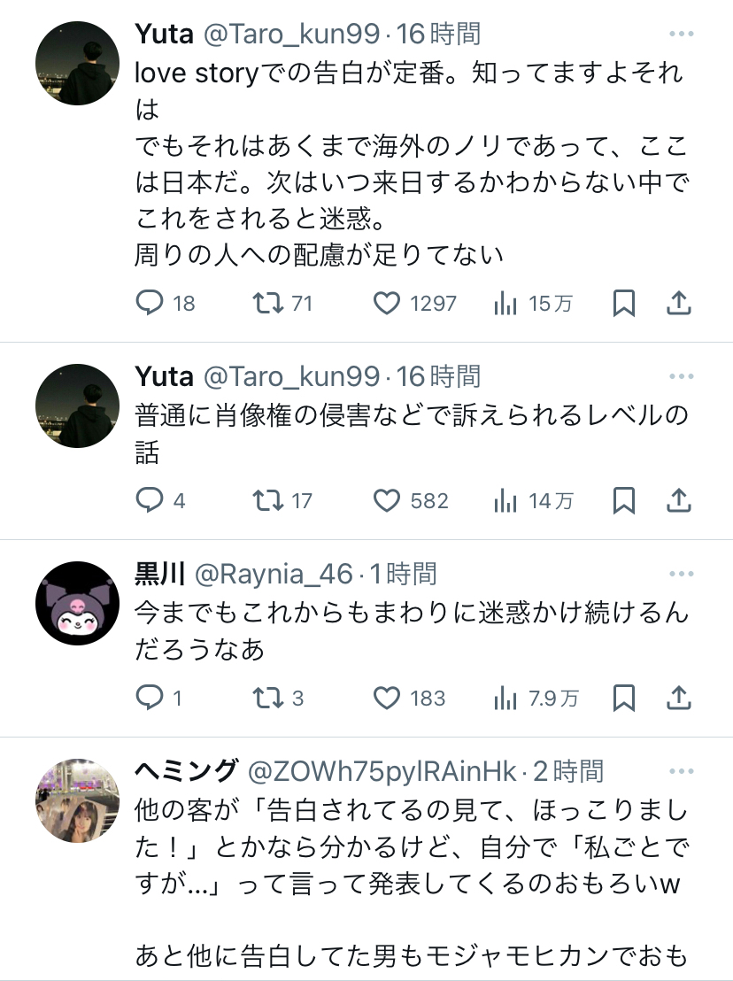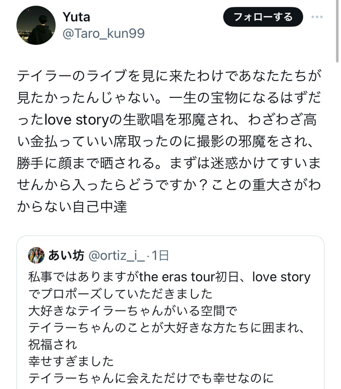 テイラーのライブを見に来たわけであなたたちが見たかったんじゃない。一生の宝物になるはずだったlove storyの生歌唱を邪魔され、わざわざ高い金払っていい席取ったのに撮影の邪魔をされ、勝手に顔まで晒される。まずは迷惑かけてすいませんから入ったらどうですか?ことの重大さがわからない自己中達 https://t.co/0nt0o1OuU7