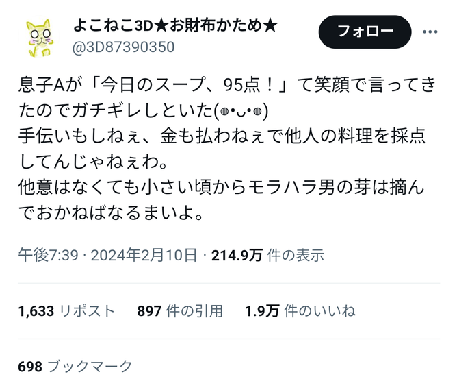 他意はなくても小さい頃からモラハラ男の芽は摘んでおかねばなるまいよ。— よこねこ3D★お財布かため★ (@3D87390350) February 10, 2024