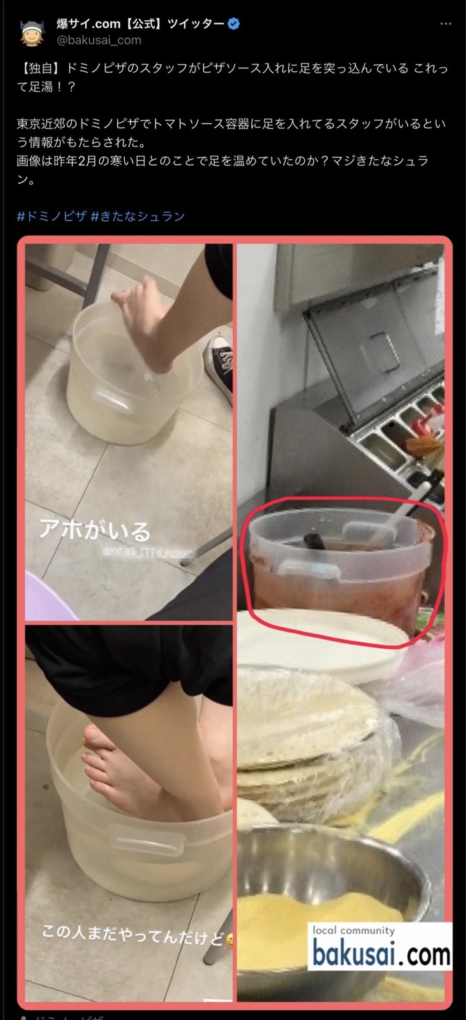 東京近郊のドミノピザでトマトソース容器に足を入れてるスタッフがいるという情報がもたらされた。