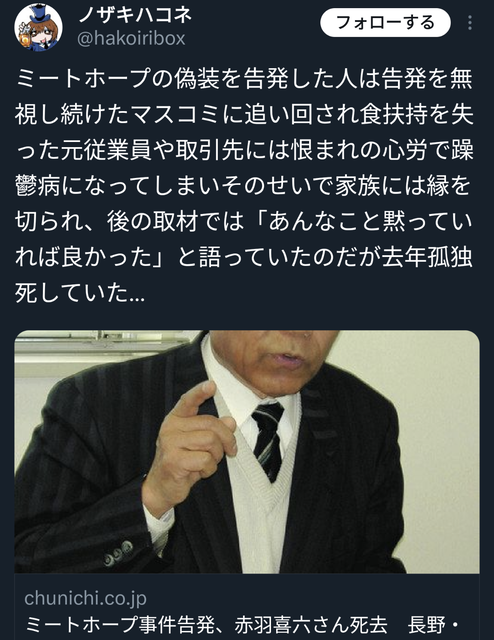 ミートホープ事件告発、赤羽喜六さん死去 長野・辰野町議選立候補表明も:中日新聞Web