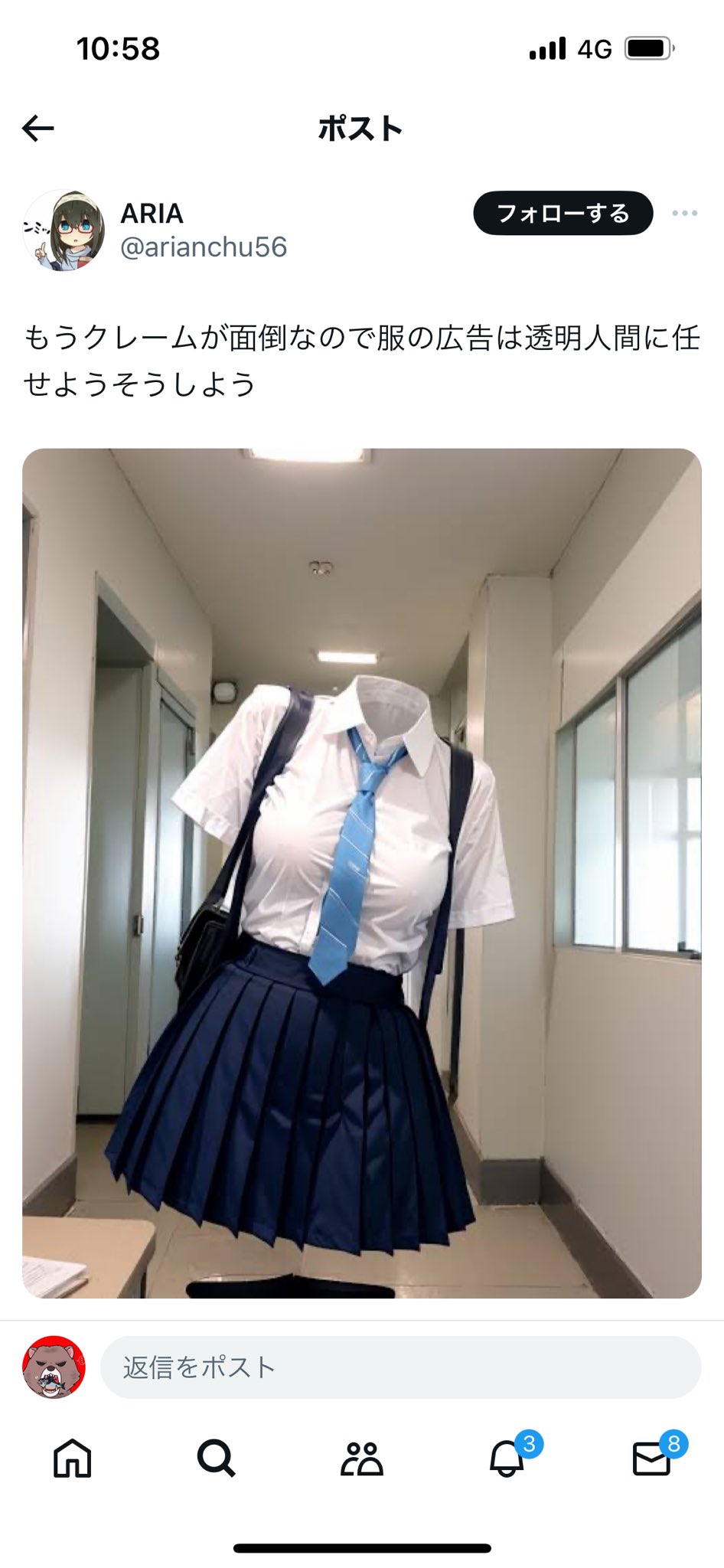 【悲報】「クレームめんどくさいから服の広告は透明人間にすればいい」と投稿した人、フェミ激怒で通報祭りからの垢凍結へ… 2024/2/18 暇人\^o^/速報 1: 以下、5ちゃんねるからVIPがお送りします 2024/02/18(日) 14:54:22.803 ID:Q8NeoDFdM.net これでもダメなのかぁ… 3: 以下、5ちゃんねるからVIPがお送りします 2024/02/18(日) 14:55:19.222 ID:9VUfEt9O0.net なんのルール違反なんだ 続きを読む Source: 暇人\^o^/速報