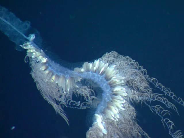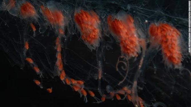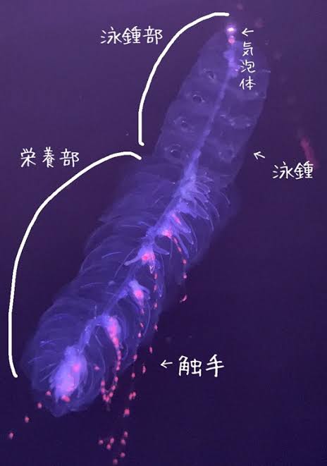 小さな頭部から無性生殖で無限増殖し、それぞれの個体が頭部に癒着し触手、消化、吸収、排泄など内臓機能を果たし一つの巨大生物として活動しているのが判明した。
