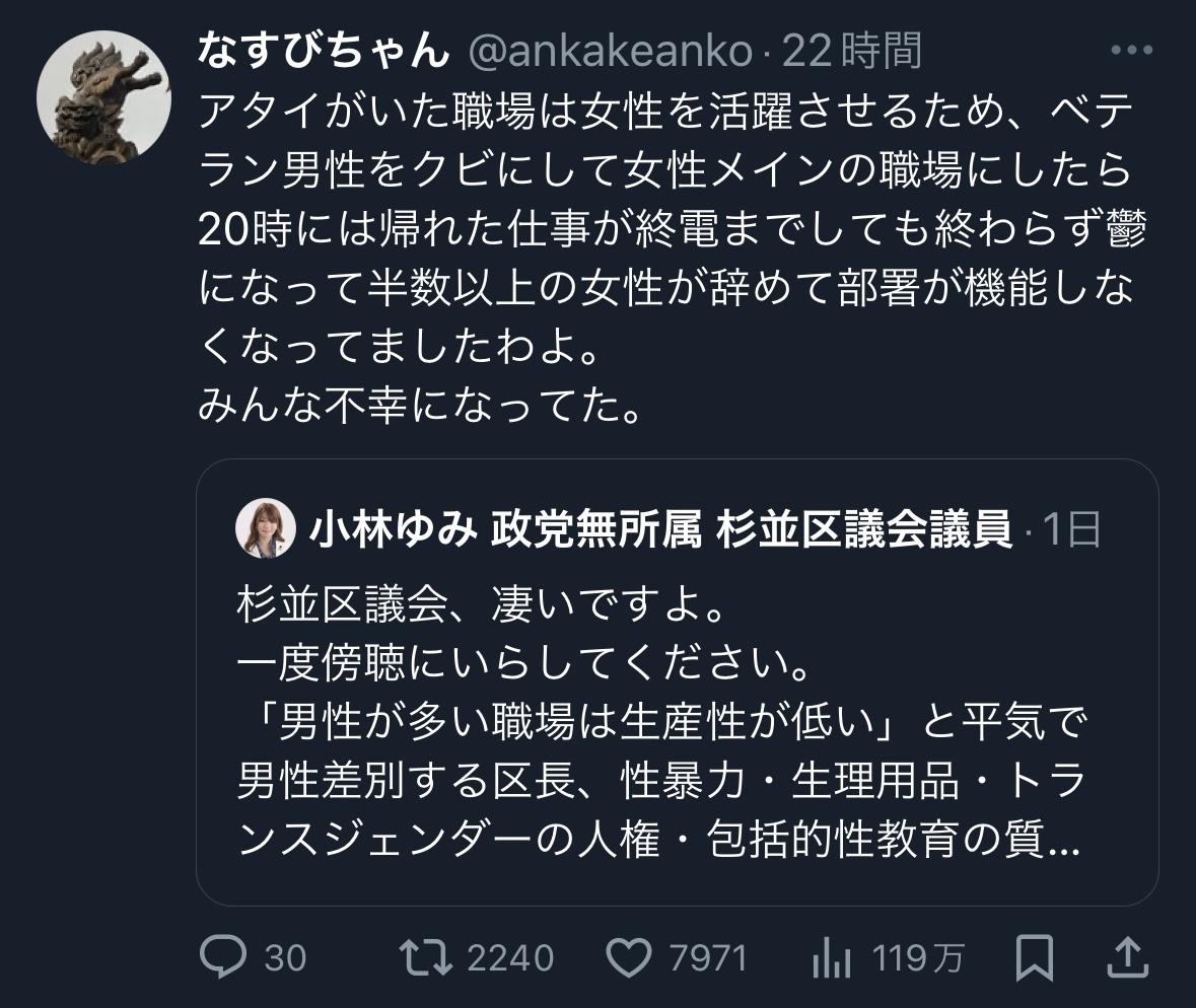 アタイがいた職場は女性を活躍させるため、ベテラン男性をクビにして女性メインの職場にしたら20時には帰れた仕事が終電までしても終わらず鬱になって半数以上の女性が辞めて部署が機能しなくなってましたわよ。