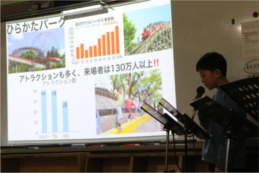「ひらかたパークは明治45年に開園した日本最古の遊園地。アトラクション数は、USJや東京ディズニーランドを上回る40種以上もあります」と地元遊園地が持つ特色や強みを力説。地元ショッピングモールのくずはモールについても、「ショッピングセンターの満足度ランキング全国13位にランクイン。改装工事でフードコート付近がとても綺麗になりました」と写真を交えて紹介した。伝統文化や地元の工場、さらには食べログやGoogleマップで人気の飲食店を取り上げ、ランキングやグラフを用いた資料で説得力を高めた。