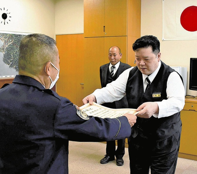 感謝状を手渡した原口憲司署長は「最初に接触するドライバーさんたちにこういった視点を持っていただくのはありがたい」と述べた。