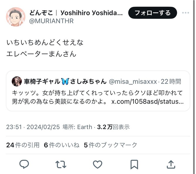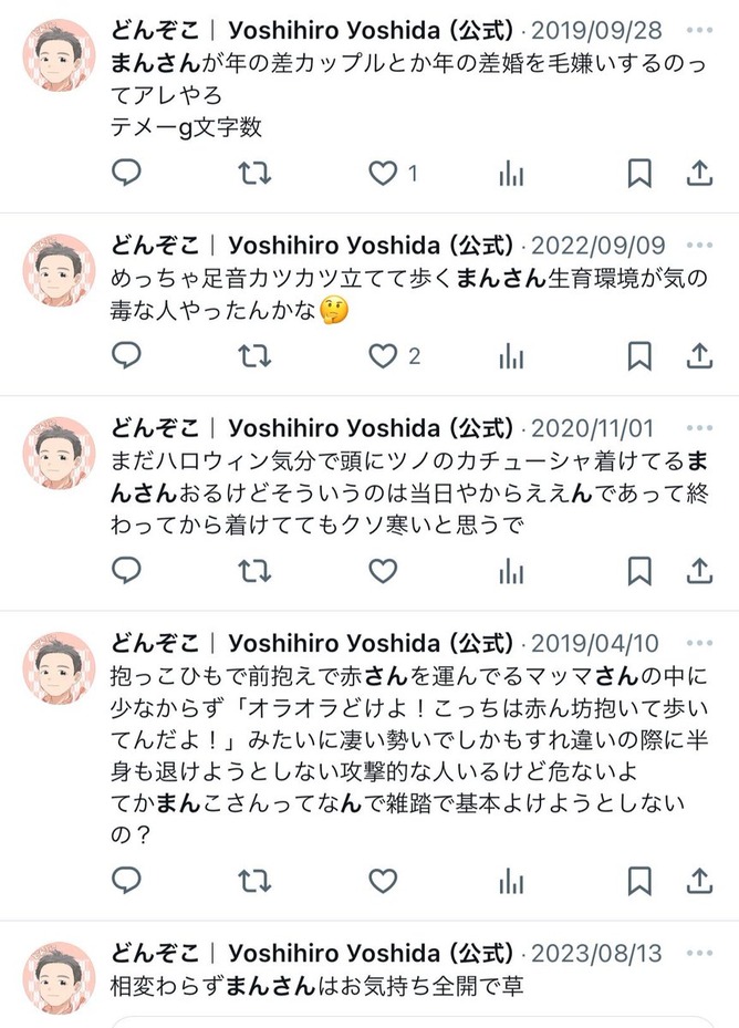 吉田選手はX上で7年ほど前から、女性を女性器で呼称し「女性は他責思考で融通が効かない」「繁忙期でも早く帰れるのは女性だけ」といった女性蔑視的な投稿を再三繰り返していた。