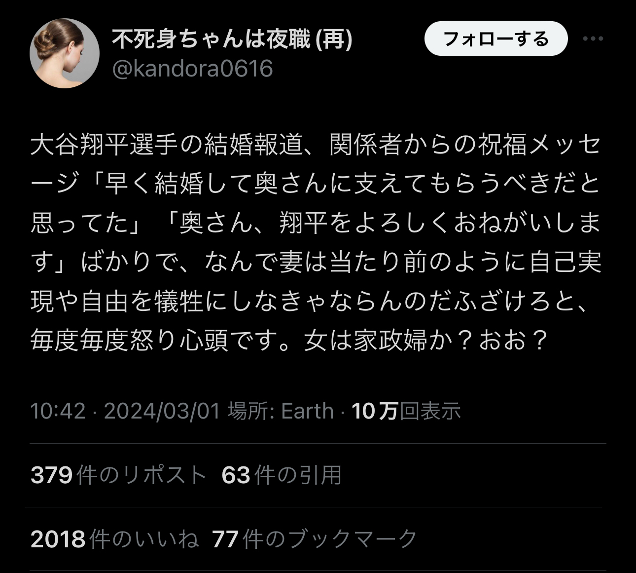 大谷と結婚して共働きを選択する気になれるものだけ石を投げなさい