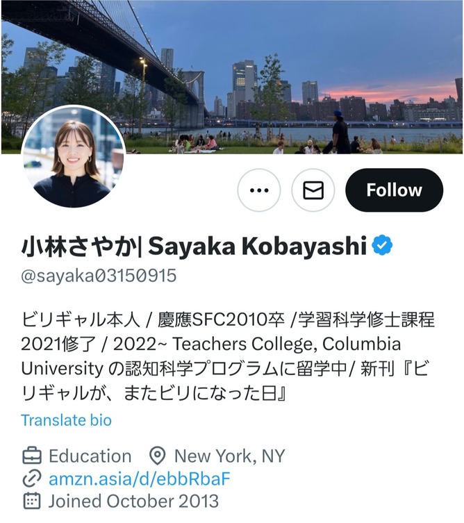 現在は留学してコロンビア大学の教育大学院に通っている模様