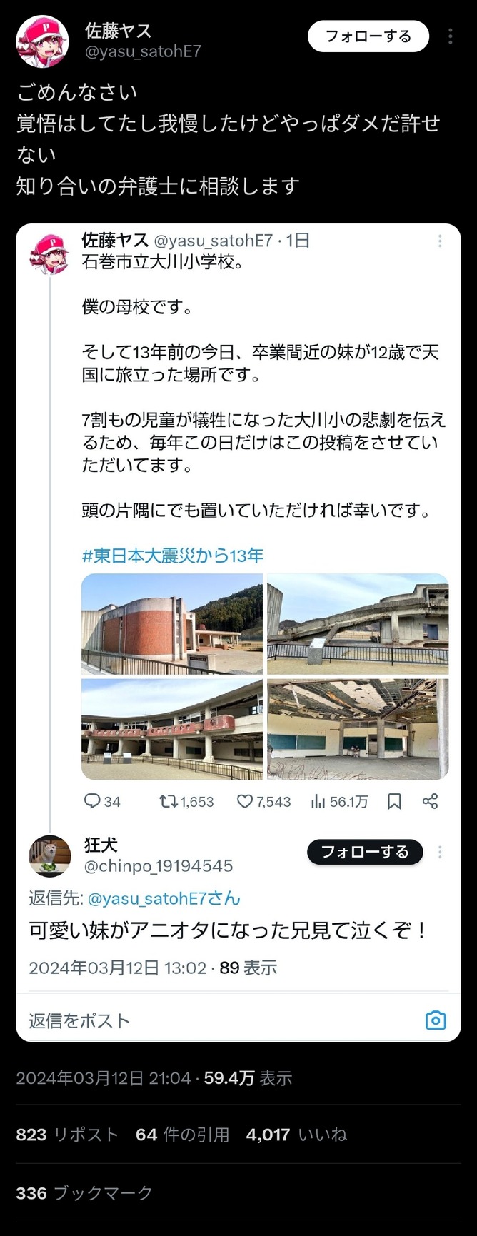 知り合いの弁護士に相談します pic.twitter.com/AqcX8Mk1H5— 佐藤ヤス (@yasu_satohE7) March 12, 2024