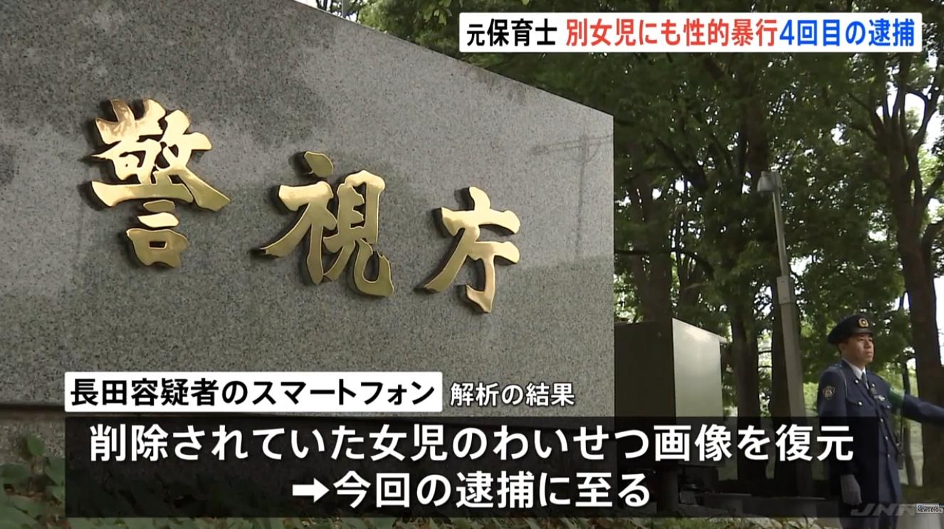 東京・墨田区の認可保育園で、園児の女の子に対して性的暴行を加えたなどとして、元保育士の男が再逮捕されました。逮捕は4度目です。警視庁によりますと、認可保育園の元保育士・長田凪巧容疑者は去年7月、勤務先の保育園で園児の女の子に性的暴行を加えた上、その様子をスマートフォンで撮影した疑いが持たれています。全文はこちら