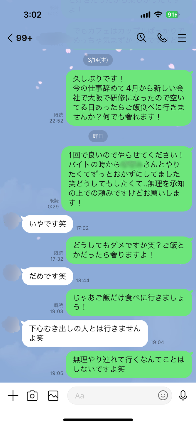 バイトで一緒に話してた時は下ネタウェルカムで誰にでも股開いてる子やけどなんでワイは無理なんや