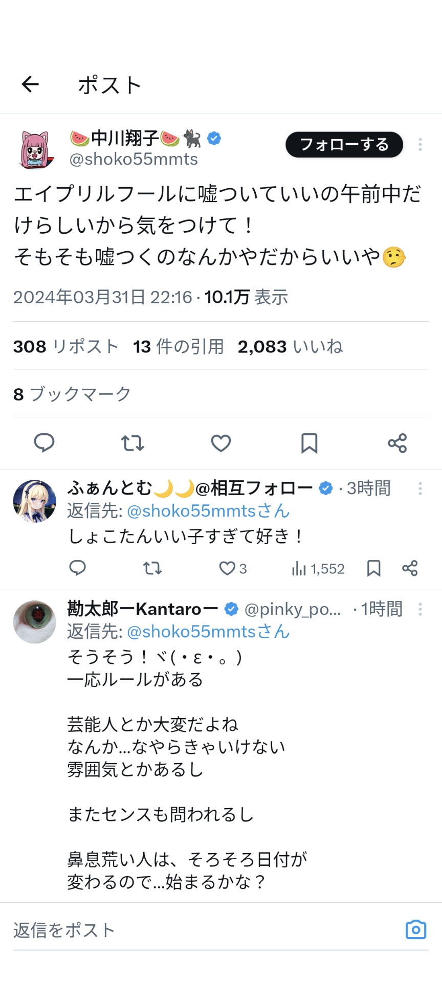 しょこたん「エイプリルフールで嘘つけるのは午前中だけだから気をつけて!」
