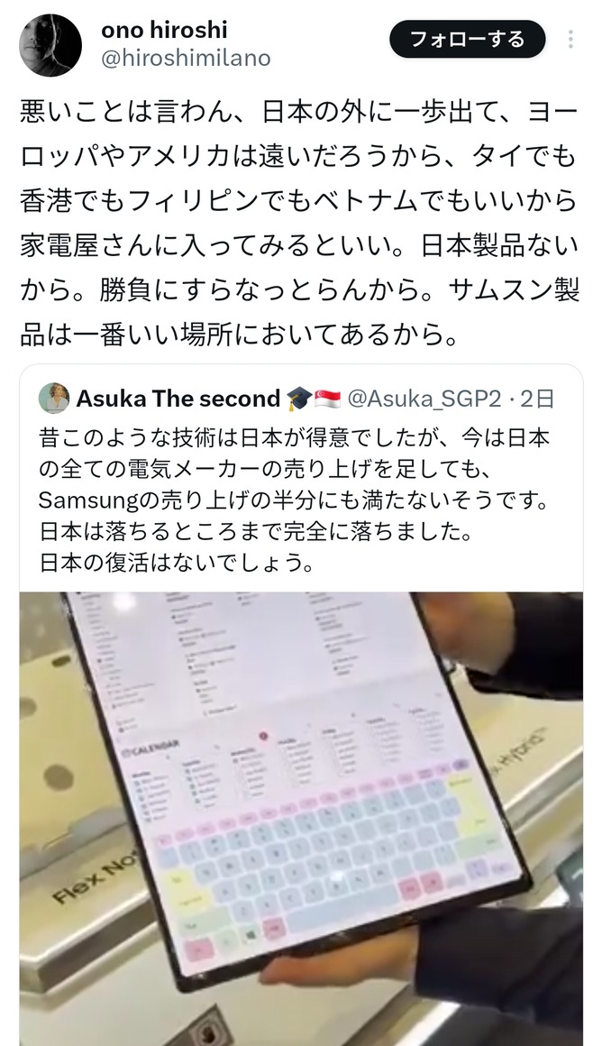 悪いことは言わん、日本の外に一歩出て、ヨーロッパやアメリカは遠いだろうから、タイでも香港でもフィリピンでもベトナムでもいいから家電屋さんに入ってみるといい。日本製品ないから。勝負にすらなっとらんから。サムスン製品は一番いい場所においてあるから。 https://t.co/QLTSpPCMwI