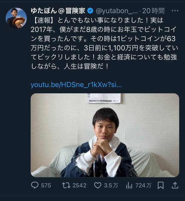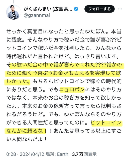せっかく真面目になったと思ったゆたぼん。本当に残念。そんなやり方で稼いだ金で誰が喜ぶ??ビットコインで稼いだ金を批判したら、みんなから時代遅れだと言われたけど、はっきり言います。その稼いだ金の中で誰が喜んでくれた????誰かのために働く→喜ぶ→お金がもらえるを実現して欲しかった。もちろ…