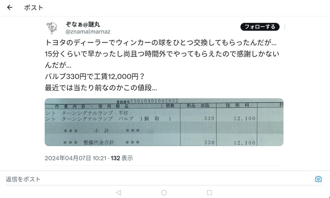 トヨタのディーラーでウィンカーの球をひとつ交換してもらったんだが…