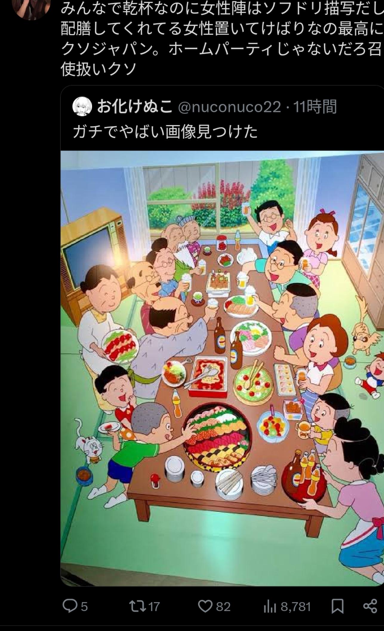 サザエに限らず、まる子母、のび太ママ、みさえも専業主婦なんだから配膳するだろ