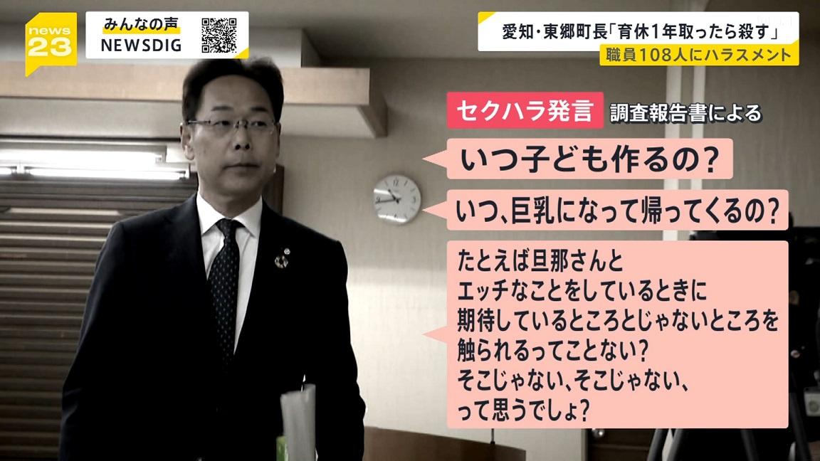 第三者委員会が22日、町に提出した報告書によりますと「お前らの脳みそは鳩の脳みそより小さい」、男性職員への「育休を1年取ったら殺すぞ」といった発言や、机の側面を蹴るなどの行為を認定し、「就任1期目から継続的に複数の職員に対し様々なハラスメントを行ってきた」としました。