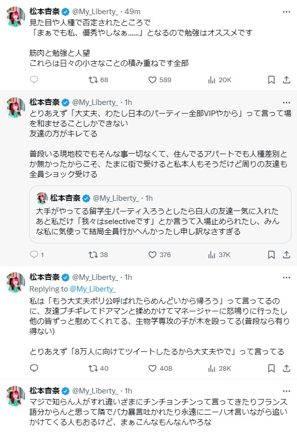 米名門スタンフォード大に現役合格して話題となったインフルエンサーの松本杏奈さんが24日、自身のX(旧ツイッター)を更新。4月上旬からフランスのパリに滞在してフランス語などを学んでいるが、留学生向けパーティーでの出来事をつづり、アジア人差別をめぐる現状を訴えた。