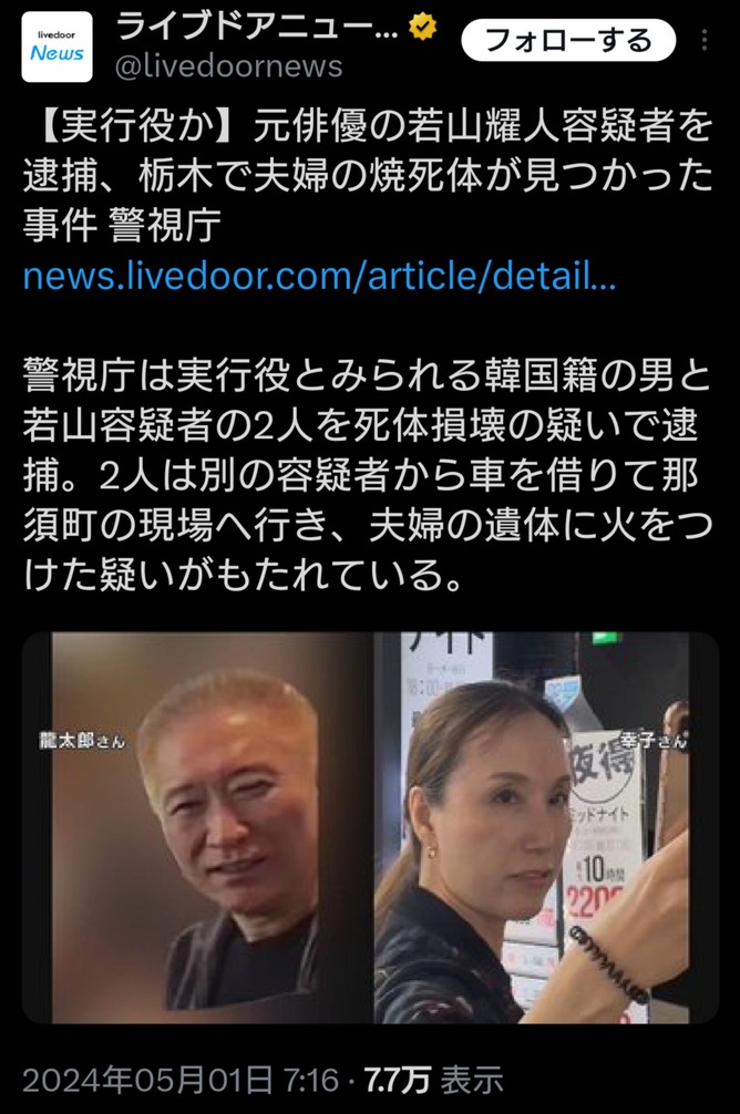 2人はいずれも住居職業不詳、韓国籍の姜光紀容疑者(20)と若山耀人容疑者(20)。捜査本部は、2人が夫妻が死亡した経緯についても、何らかの事情を知っているとみて調べを進める。