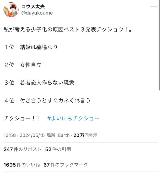 1:それでも動く名無し 警備員[Lv.12][新] : 2024/05/19(日) 18:58:29.63 ID: ID:aUKcaUO7d