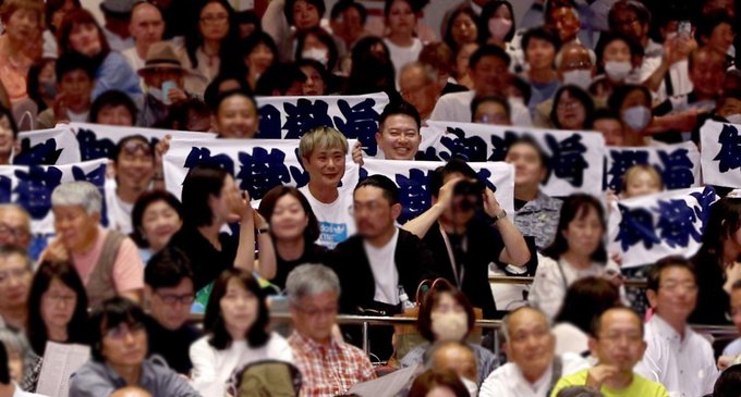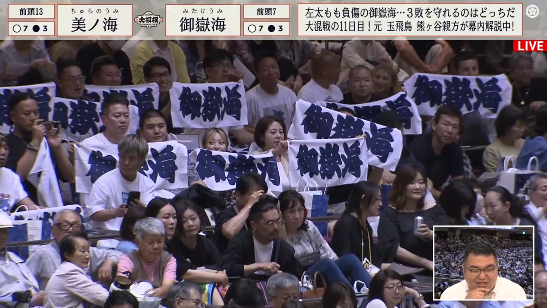 (中略)宮迫は御嶽海応援団の一員として観戦したもよう。「御嶽海」の文字が記されたタオルを掲げているところが中継に抜かれると、SNSでは「突然の宮迫で草」、「宮迫いる」、「御嶽海推し?」、「がっつりNHKに映る!」、「とうとう、地上波に宮迫出たなwww」などの声が上がっている。全文はこちら