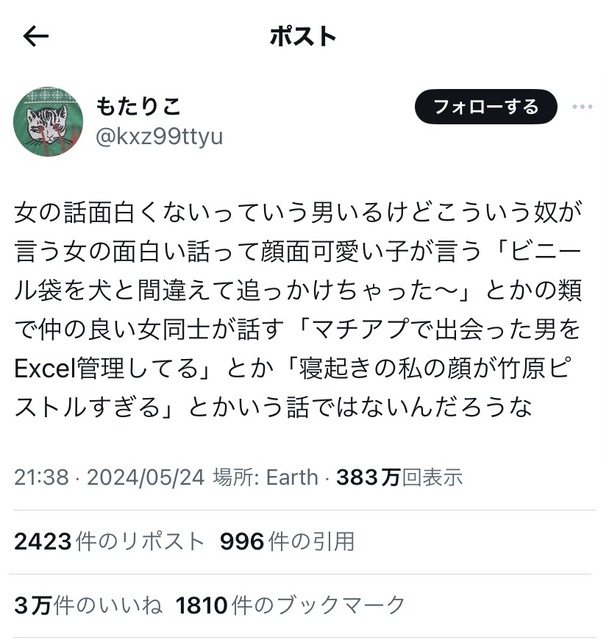 女の話面白くないっていう男いるけどこういう奴が言う女の面白い話って顔面可愛い子が言う「ビニール袋を犬と間違えて追っかけちゃった?」とかの類で仲の良い女同士が話す「マチアプで出会った男をExcel管理してる」とか「寝起きの私の顔が竹原ピストルすぎる」とかいう話ではないんだろうな