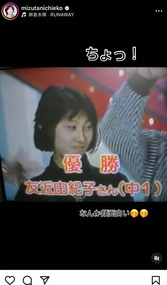 「初めて友近ちゃんが全国ネットの素人歌番組にでた時 14歳 渡辺美里さんのロングナイト 麻倉未稀さんのラナウェイを歌唱したわ #全国ジュニア歌謡選抜 #うまく嬉しさの表現ができない顔 #優勝 #右耳と前歯1本」と添え、はにかんでいる14歳の友近のショットをアップ。