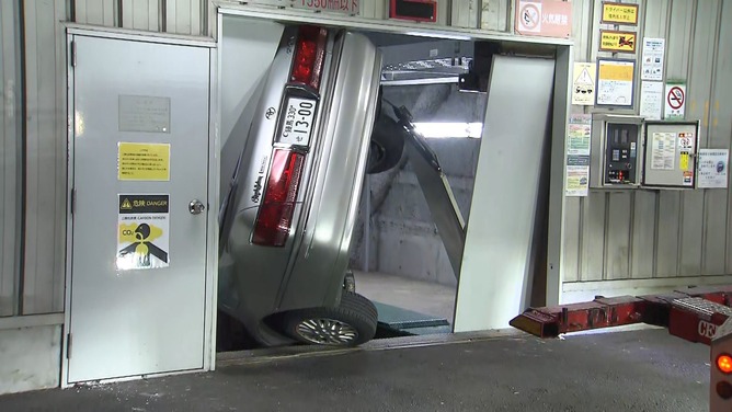 車が立体駐車場のエレベーターの扉突き破る 女性がひきずられてけが