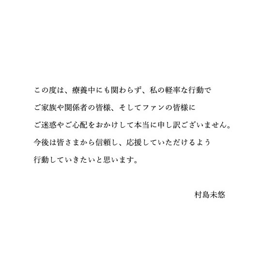 「この度は、療養中にも関わらず、私の軽率な行動でご家族や関係者の皆様、そしてファンの皆様にご迷惑やご心配をおかけして本当に申し訳ございません。今後は皆さまから頼し、応援していただけるよう行動していきたいと思います。村島未悠」