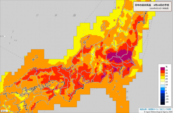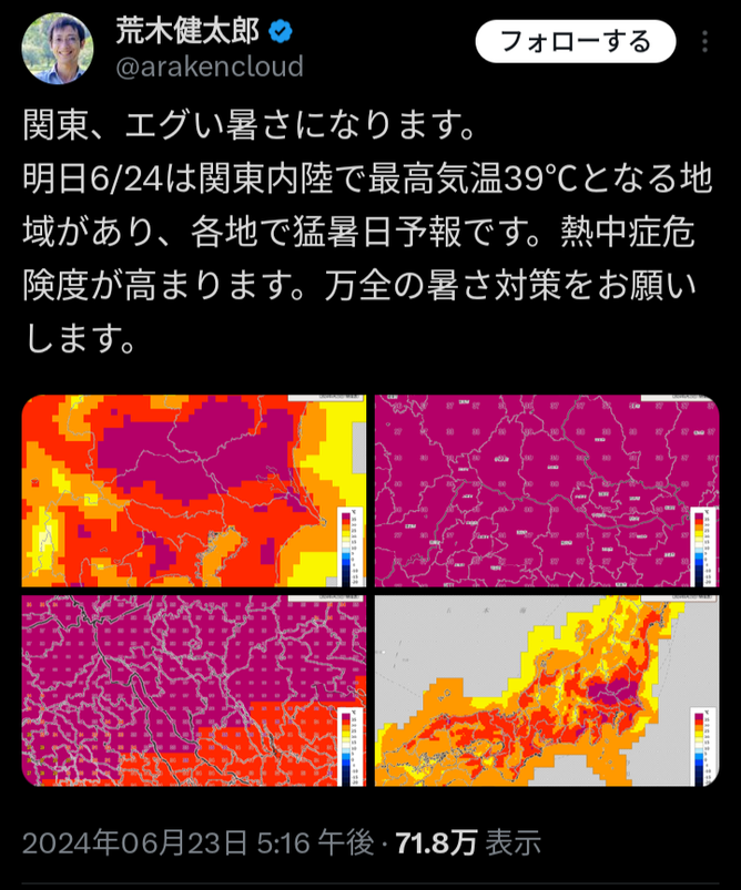 明日6/24は関東内陸で最高気温39℃となる地域があり、各地で猛暑日予報です。熱中症危険度が高まります。万全の暑さ対策をお願いします。 pic.twitter.com/1tiObXx4uG— 荒木健太郎 (@arakencloud) June 23, 2024