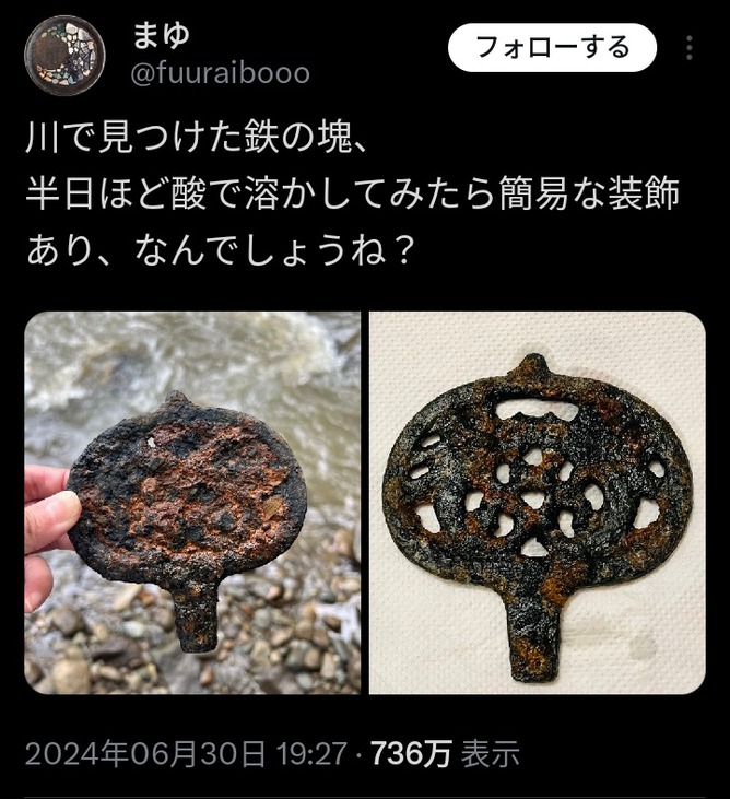 半日ほど酸で溶かしてみたら簡易な装飾あり、なんでしょうね? pic.twitter.com/UT0Pu9hb5P— まゆ (@fuuraibooo) June 30, 2024