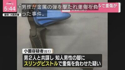 4月1日、大阪市東淀川区のマンションで、知人男性に対しスリングピストルで鋼球を発射したなどとして、男が逮捕された。男性の右足には直径約6ミリの鋼球1発がめり込み、3週間のけがをした。被害男性は「熱くて拳銃かと思った」と話しているという。