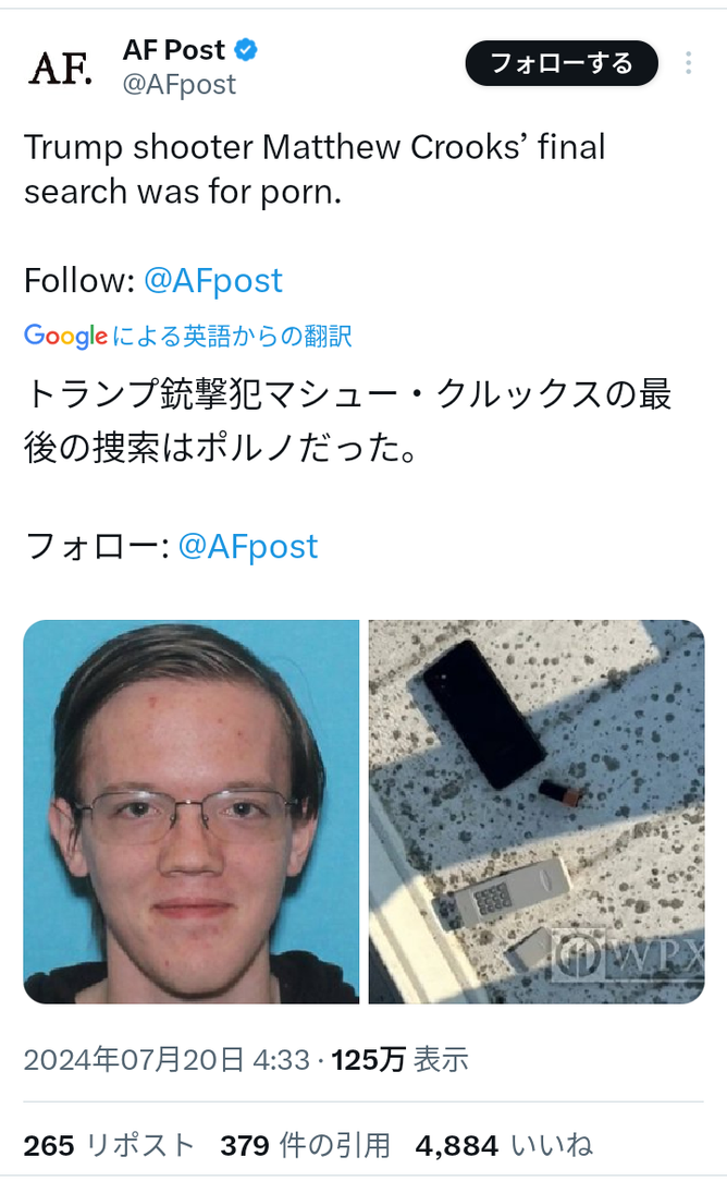 【悲報】トランプ狙撃したチー牛が最後に検索していた単語がヤバい
