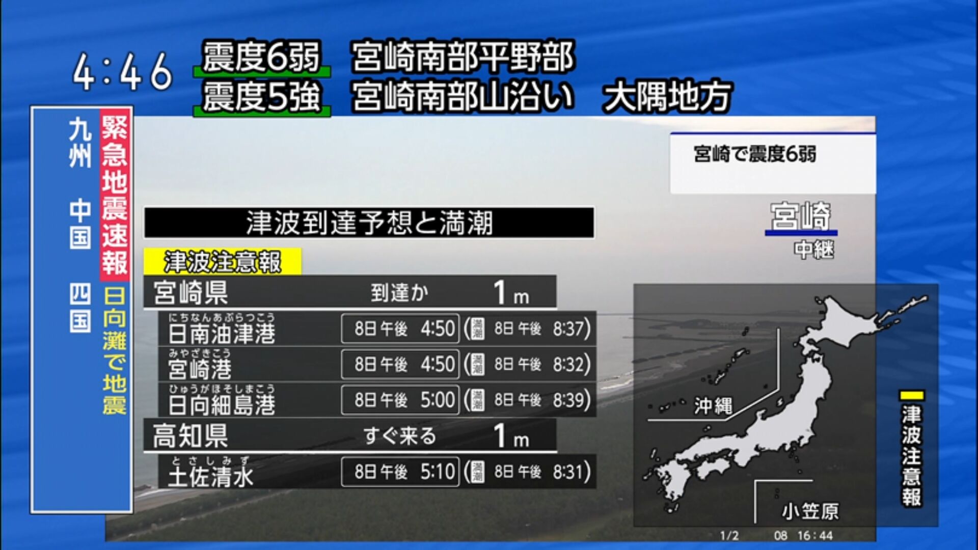 16時42分頃、日向灘を震源とする地震がありました。震源の深さは約30km、地震の規模はM6.9、最大震度6弱を宮崎県で観測しています。 pic.twitter.com/M9Z19rmbPt— ライブドアニュース (@livedoornews) 2024年8月8日