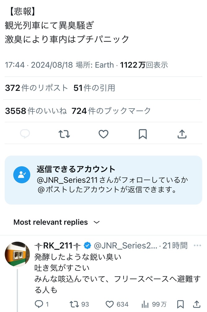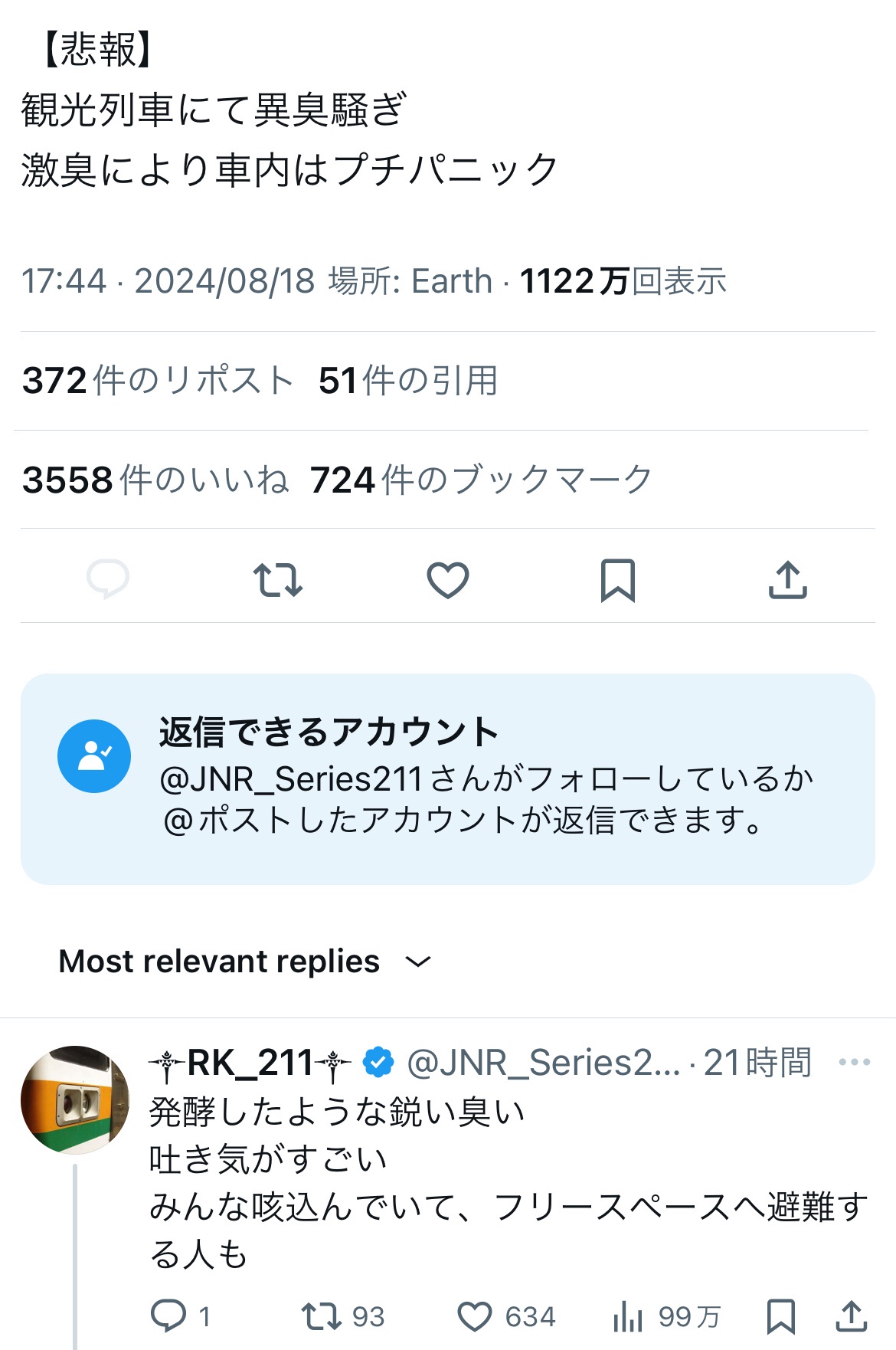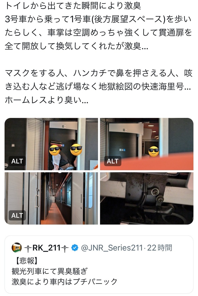 ホームレスより臭い… https://t.co/n7IX1wjUgA pic.twitter.com/kvZBo2sPQX— ༒RK_211༒ (@JNR_Series211) August 18, 2024
