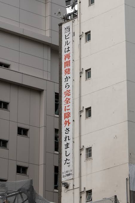 地権者(金券屋や金融系)が立ち退かなかったためオシャレな再開発ビルのエントランスの両隣が雑居ビルに