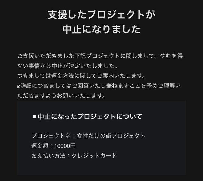 ご支援いただいた方々には申し訳ないのですが、リターンは、今現在ありません。といいますのもリターンを設定してしまうと、女性を搾取することになってしまうからです。なので今現在は「感謝のメールを送らせてもらう」というもののみになります。 pic.twitter.com/p3XR9oUA9c
