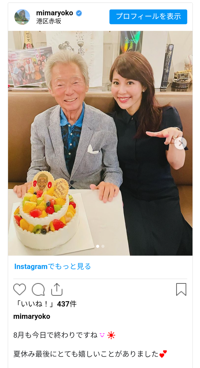 美馬はインスタグラムで、みのとの2ショット写真を掲載。「8月も今日で終わりですね。夏休み最後にとても嬉しいことがありました。みのさんの80才のお誕生日をお祝いさせていただきました。傘寿の会です。しかも朝ズバファミリーが揃いました」とつづった。