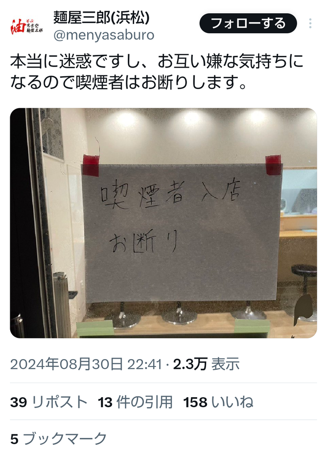 店の内はもちろん外で吸わなくても喫煙者ってだけでアウトなの?