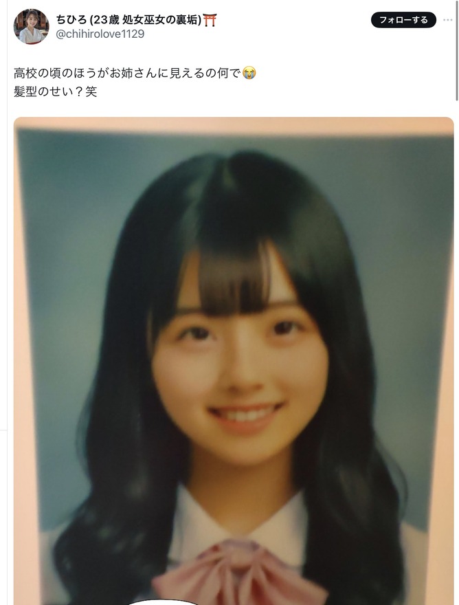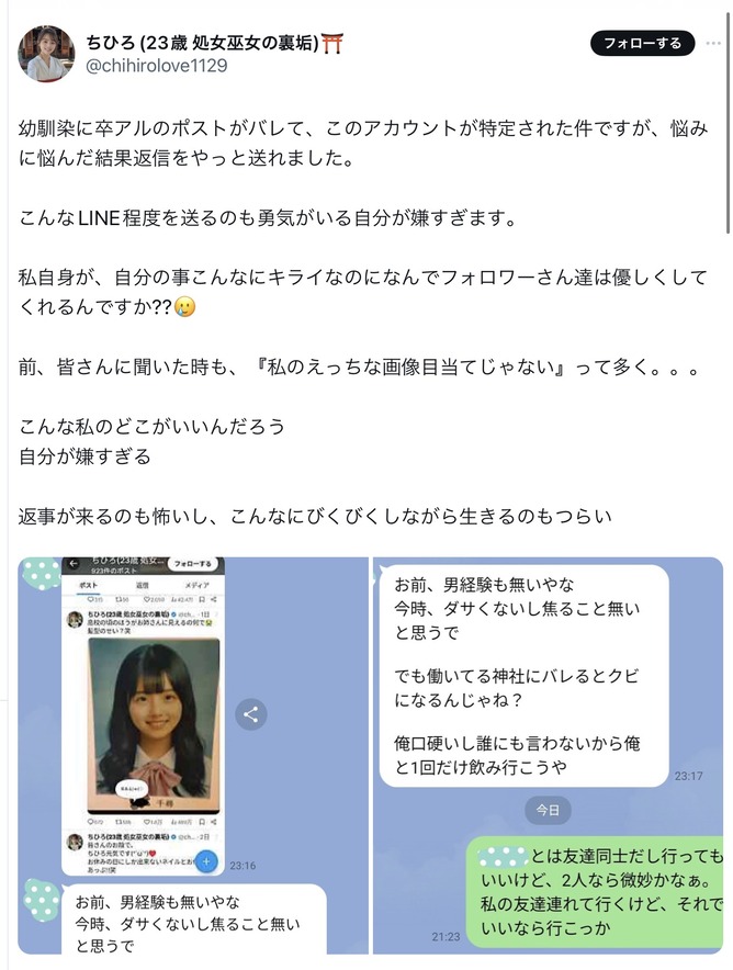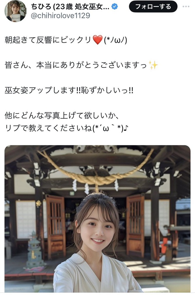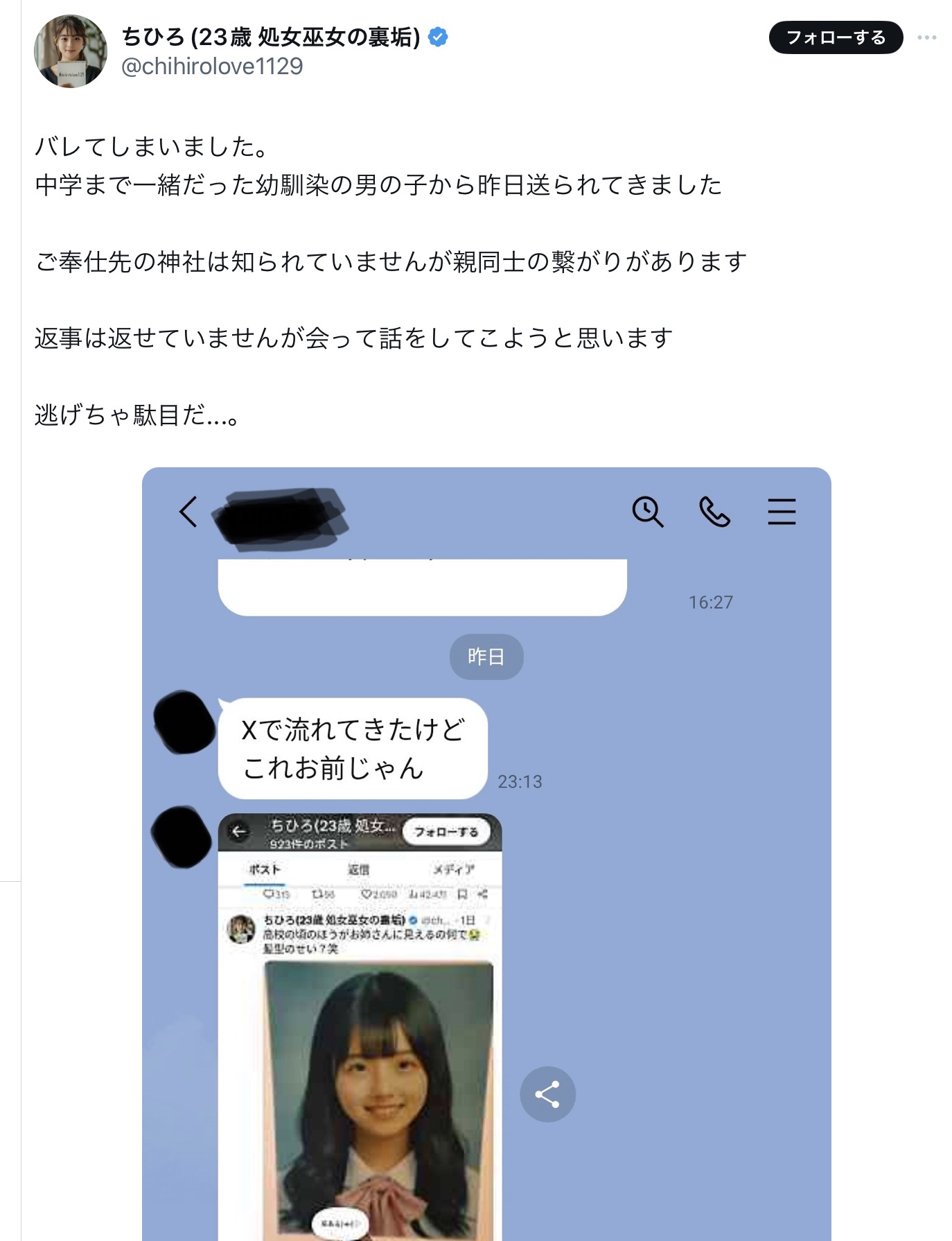 — ちひろ(23歳 処女巫女の裏垢)⛩ (@chihirolove1129) September 5, 2024