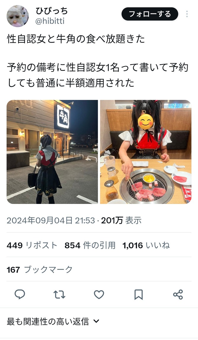 【画像】X民「牛角食べ放題の女性半額は性自認女でもOKってマジ?女装して行ってみるわ🥺」