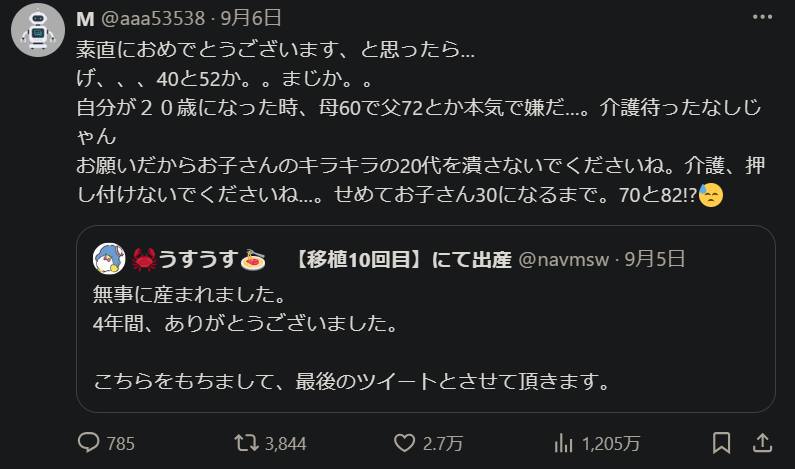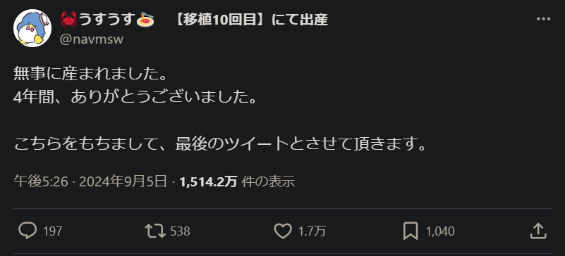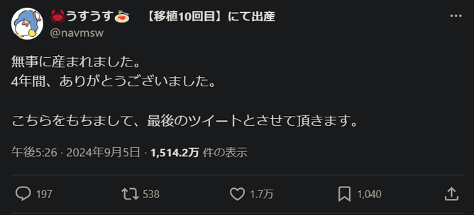— 🦀うすうす🍝 【移植10回目】にて出産 (@navmsw) September 5, 2024