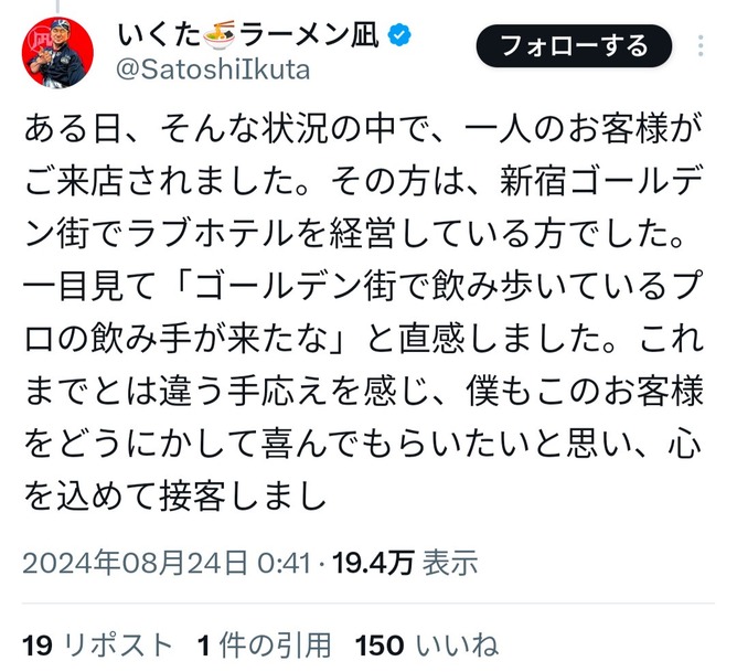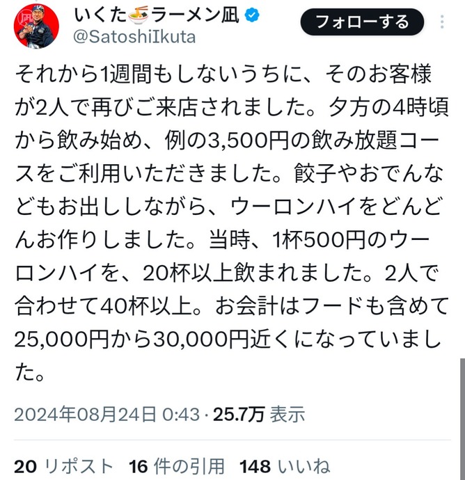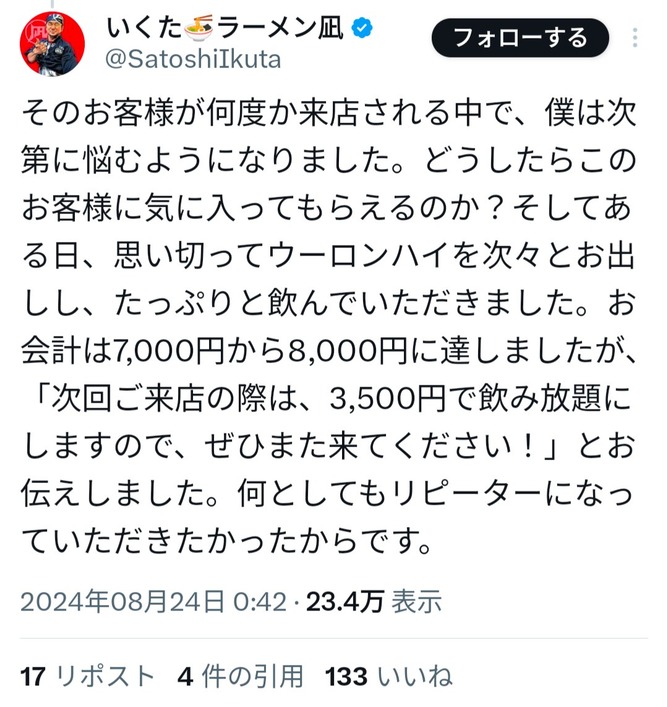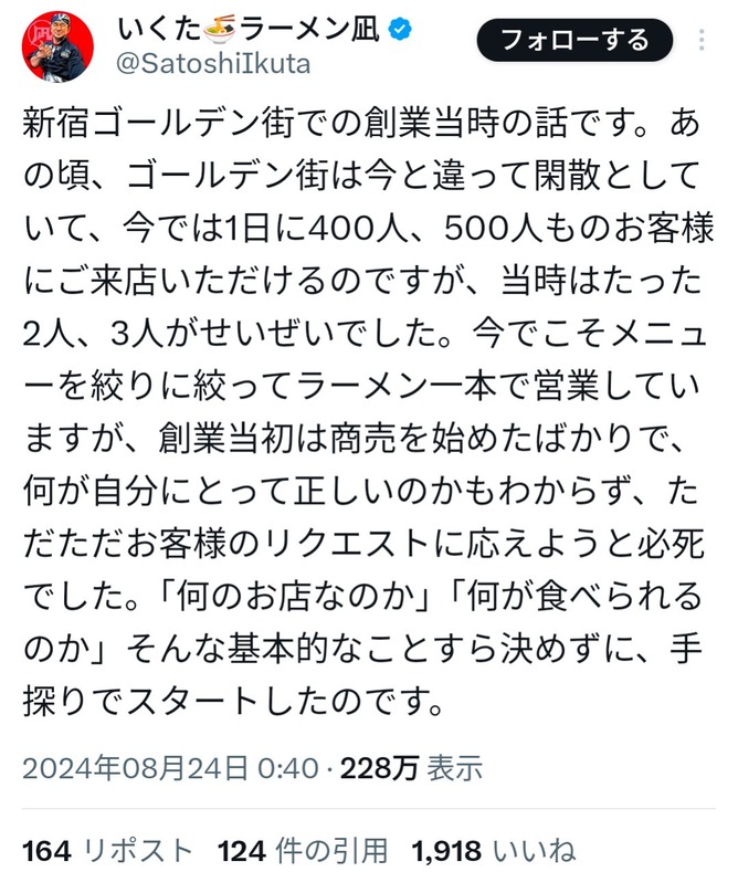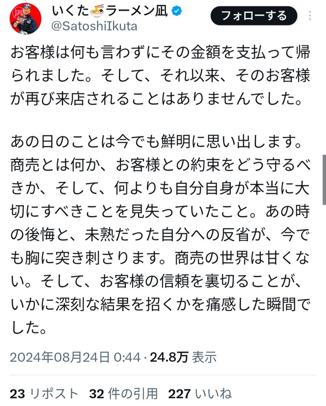 — いくた🍜ラーメン凪 (@SatoshiIkuta) August 23, 2024