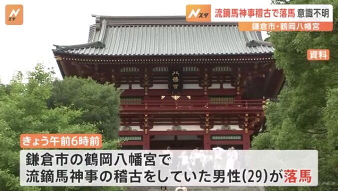 きょう15日午前6時ごろ、鎌倉市の鶴岡八幡宮で「男性が流鏑馬の練習中に落馬した」と119番通報があった。警察によると、男性は流鏑馬神事に向けた稽古中に落馬し、意識不明の重体となっている。 pic.twitter.com/Iwt79JBlpH