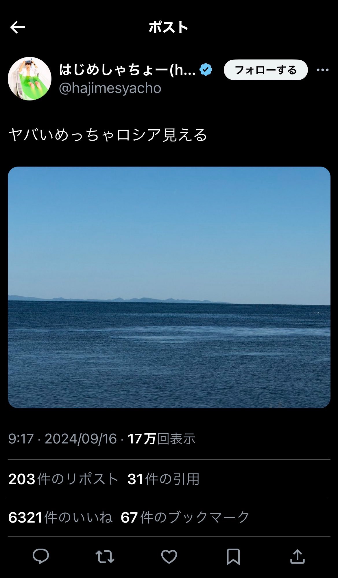 日本政府の見解に合わせるならば、はじめしゃちょーは「帰属未定地が見える」とポストすべきだったかもしれません。「ロシア見える」と書いたことは、意図的ではないにせよロシアの実効支配を認めるような立場になってしまうため、投稿を削除したのではないかと思われます。