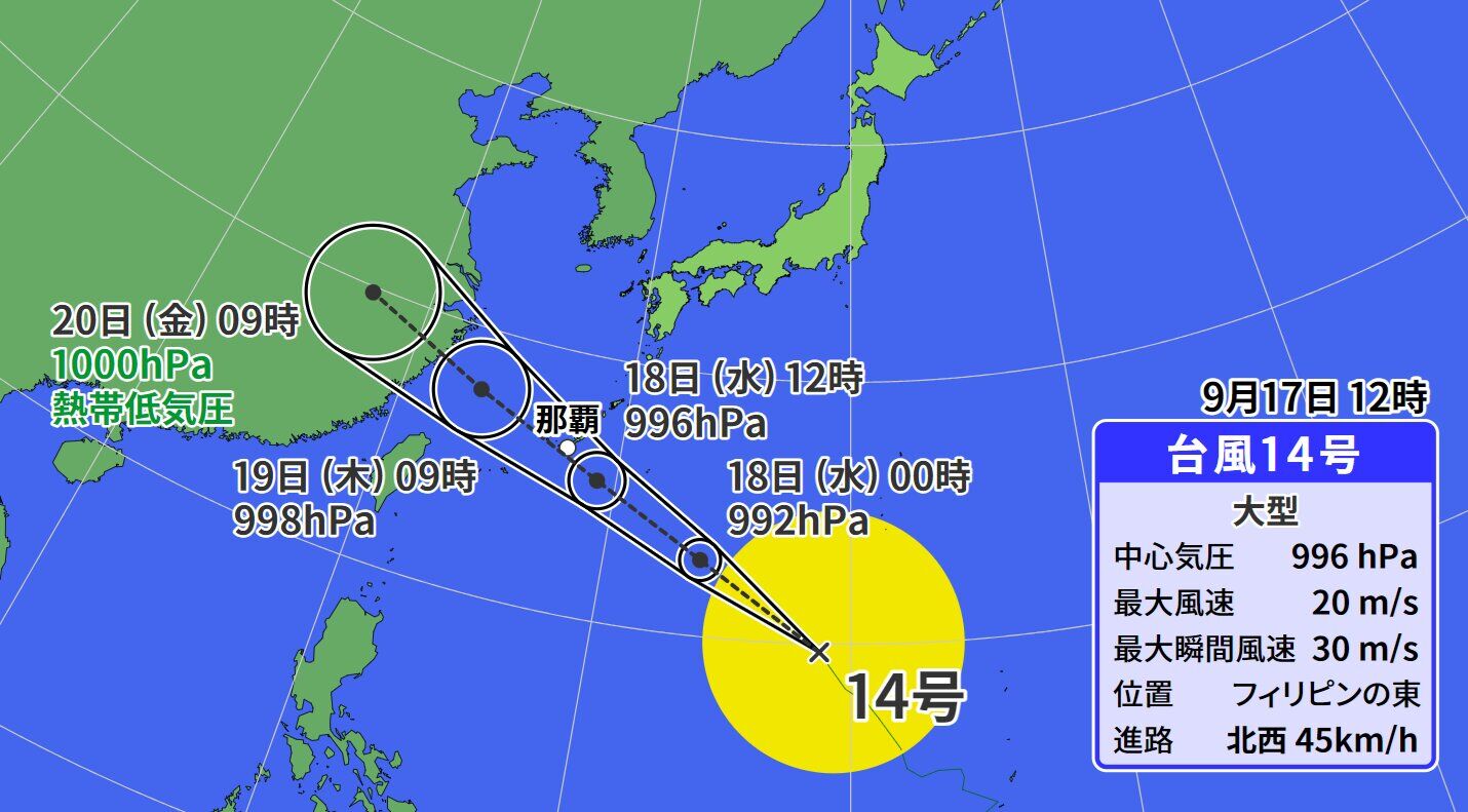 そうはならんやろ【台風14号 22日に温帯低気圧として北陸通過か 秋雨前線も活発化 大雨に警戒】 https://t.co/M2FCYANJ4U 台風14号は華中へ進みましたが、このあと、急激に進路を東へ変え、22日(日)に温帯低気圧として北陸付近を通過するでしょう。