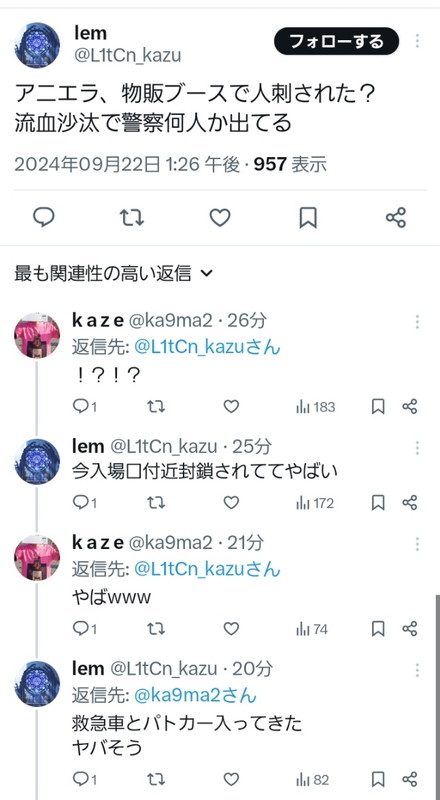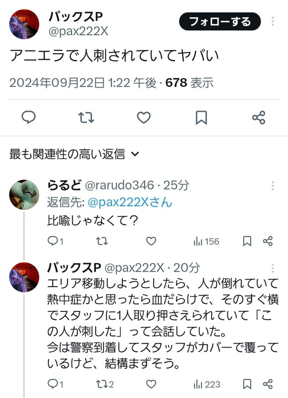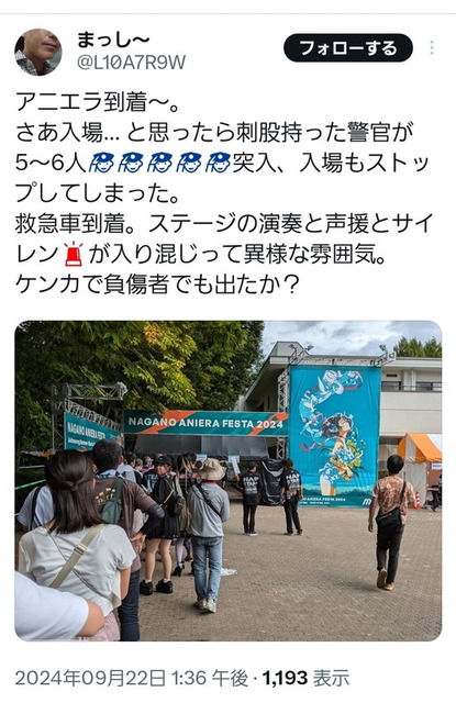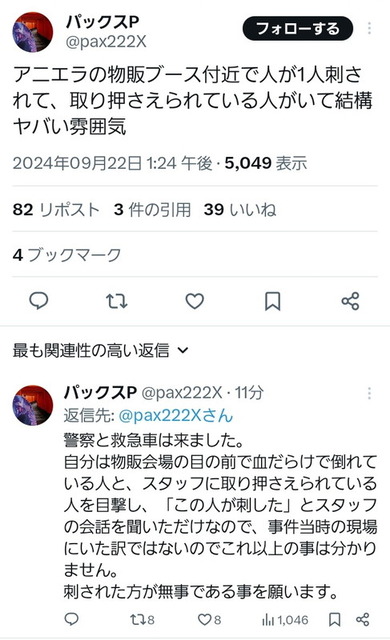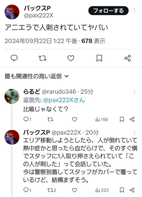 長野のアニソンフェスで刺傷事件が発生 X民「オタクがオタクに刃物刺されてて血飛沫上げてて血の気引いた。」 2024/9/22 キニ速 1:エッヂの名無し :2024/09/22(日) 13:59:22.153ID:XWPtGhITg 人が刺されて警察と救急車が来てるらしい 続きを読む Source: キニ速