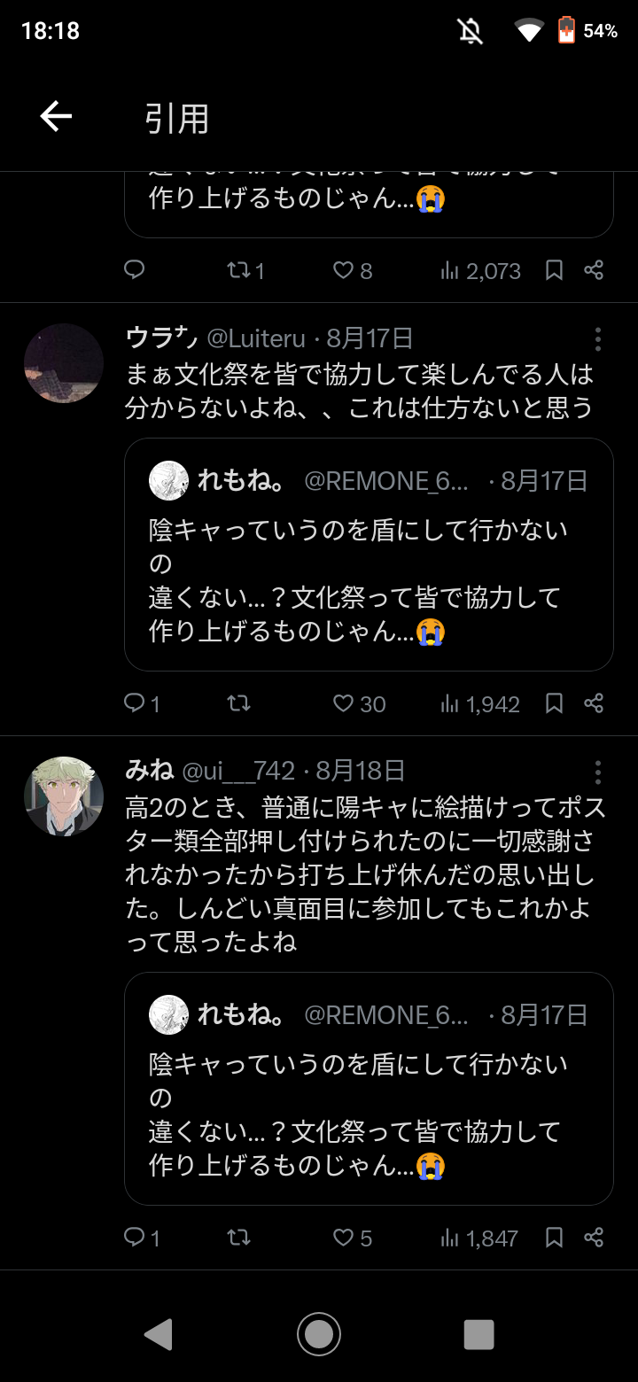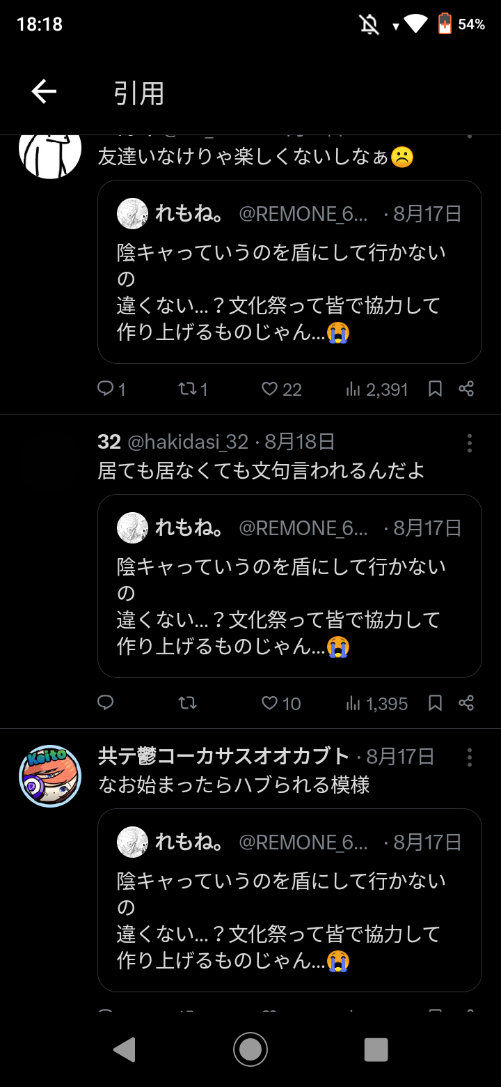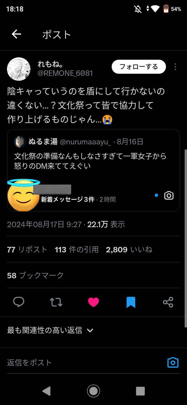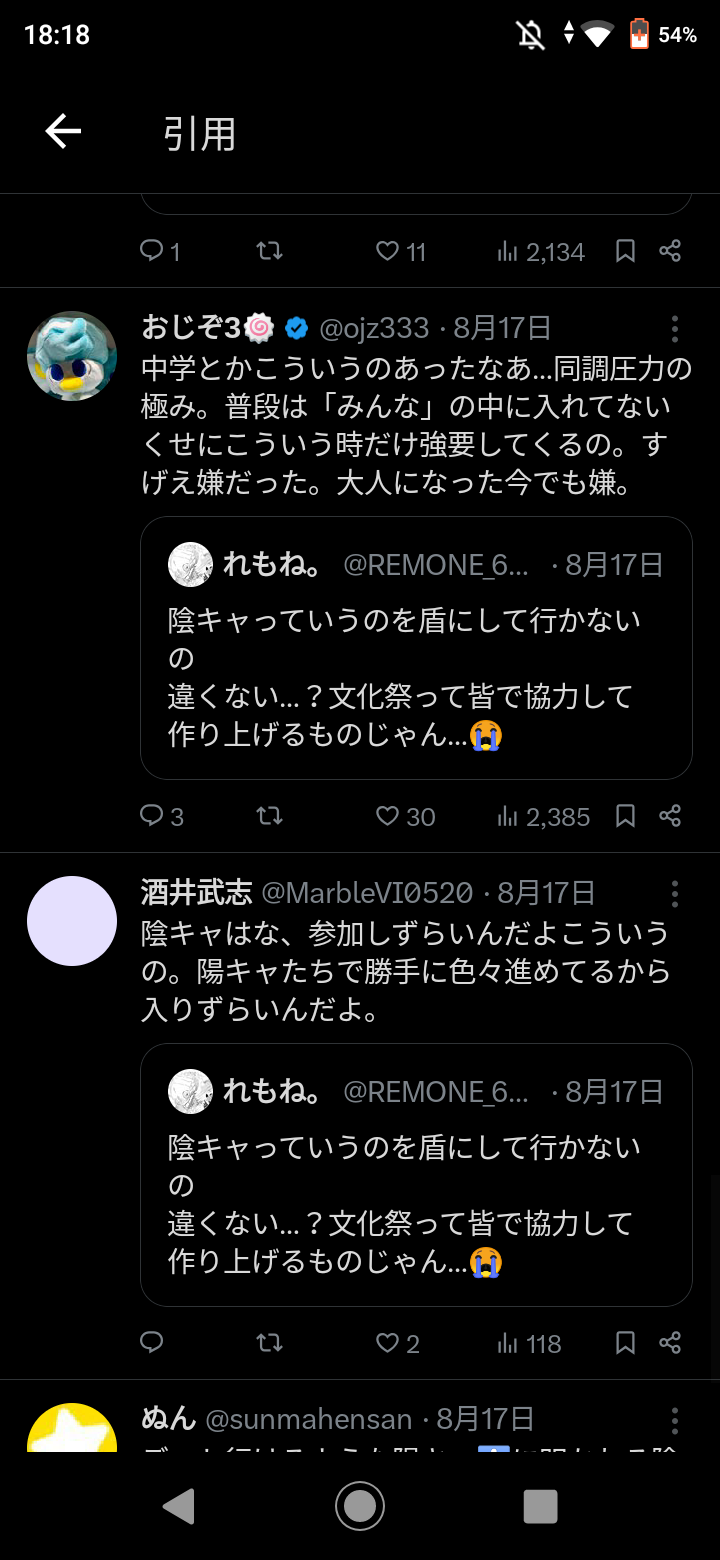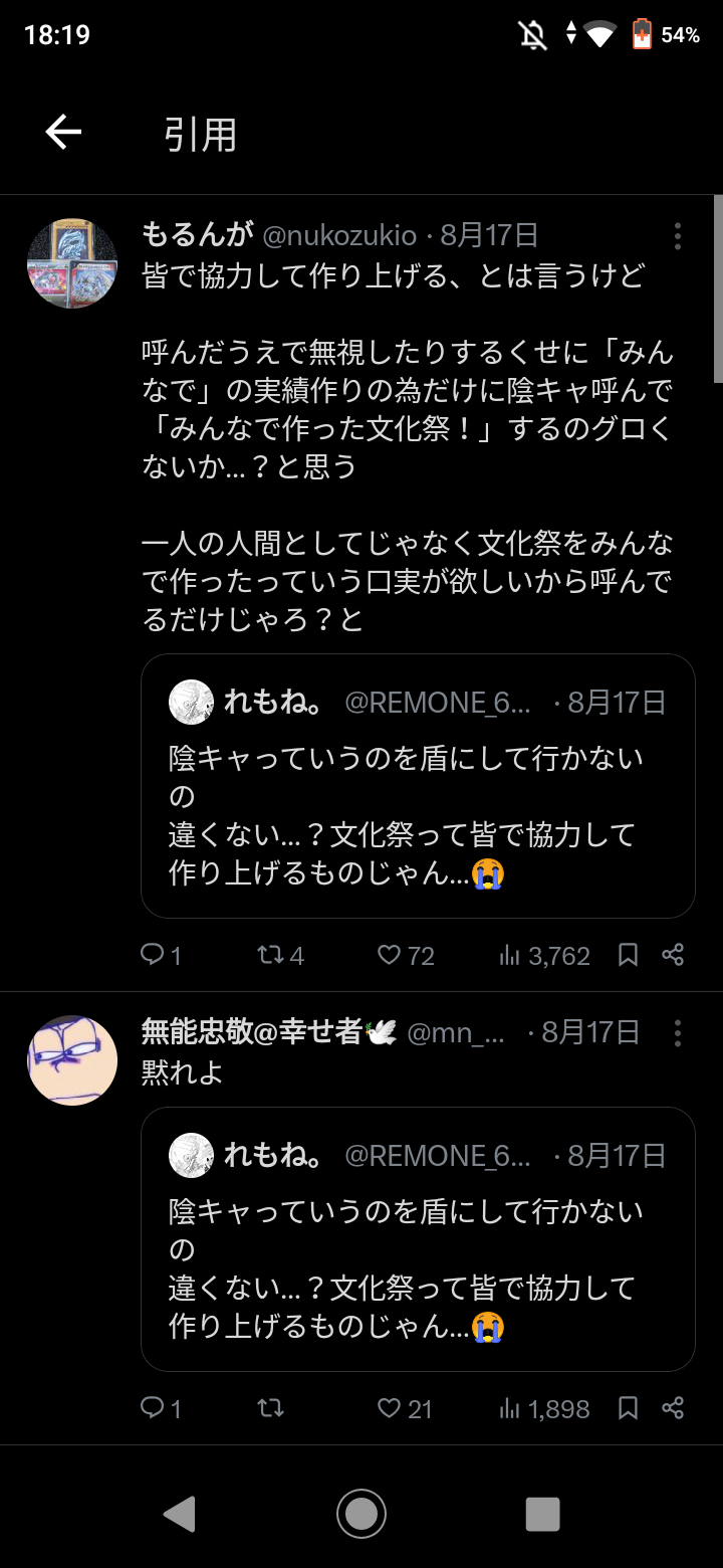 陽キャ「陰キャ君さあ…文化祭って皆で協力して作るものじゃん」←炎上 2024/9/24 キニ速 1:それでも動く名無し 警備員[Lv.51][SR武][SSR防]: 2024/09/22(日) 18:20:53.71 ID:6d7RRrY40 4:それでも動く名無し 警備員[Lv.12]: 2024/09/22(日) 18:24:09.80 ID:xjwidMsb0 また陰キャくんは言い訳ばっかり 5:それでも動く名無し 警備員[Lv.15]: 2024/09/22(日) 18:25:14.02 ID:nMey5pqm0 どっちの意見も分かる 続きを読む Source: キニ速