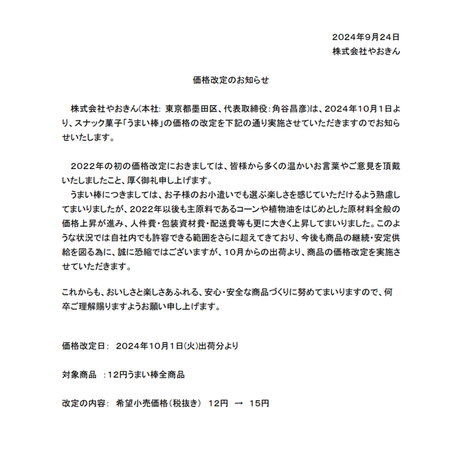 【価格改定】「うまい棒」値上げ、税別12円→15円に 10月1日出荷分からhttps://t.co/2rPRC1BI36