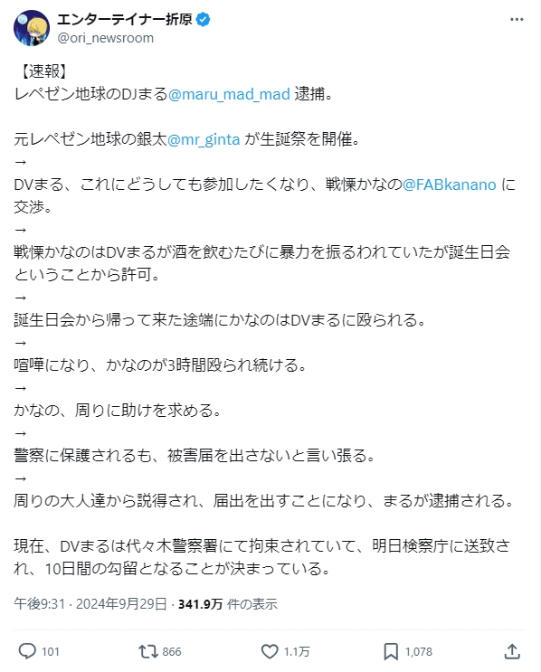 →…— エンターテイナー折原 (@ori_newsroom) September 29, 2024